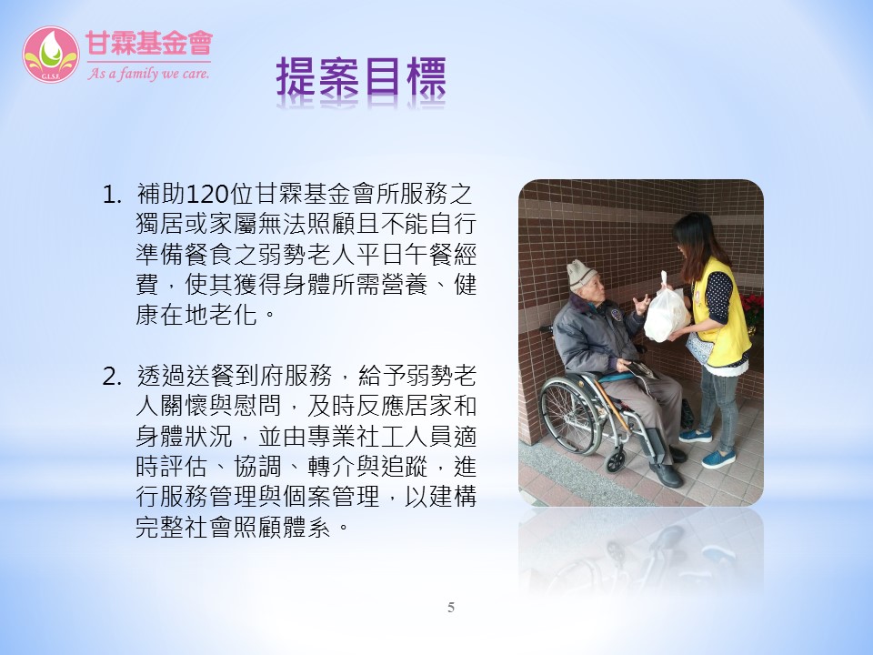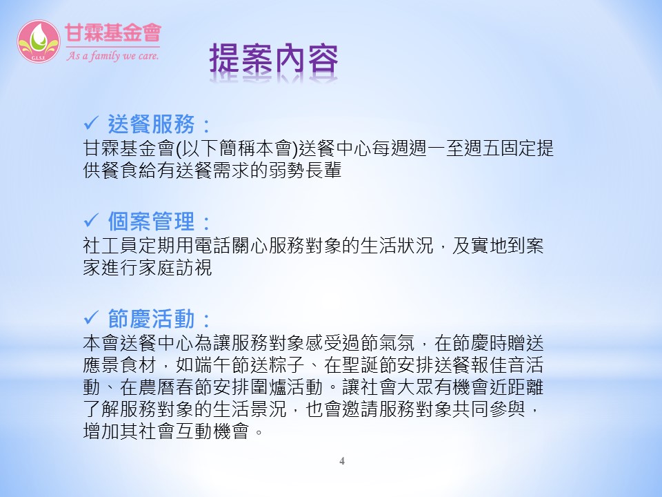 入選單位四:財團法人台中市私立甘霖社會福利慈善事業基金會「聽見角落的聲音-弱勢獨居長輩送餐服務」